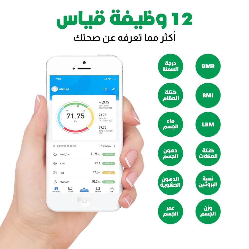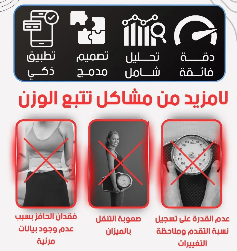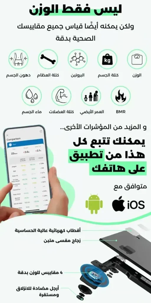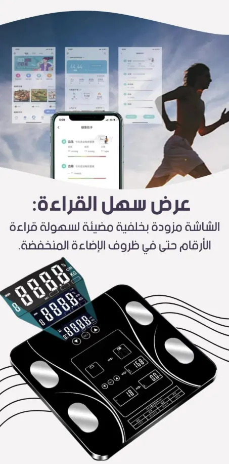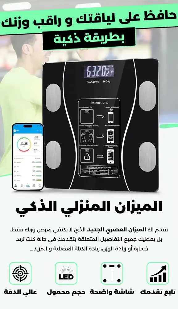 الميزان الذكي سيكون إضافة كبيرة لتتبع صحة جسمك و لياقتك كرياضي حتى لمرضى السكري و الضغط الدموي أو المرأة الماكثة في البيت و كبار السن ، يجنبك التنقل في كل مرة للصيدلية لمعرفة وزن جسمك مزود بوظيفة تحليل جسم الإنسان تقنية متقدمة لقياس وزن المستخدم يمكنك من معرفة نسبة الدهون في الجسم ومياه الجسم، معرفة كتلة العضلات وتوصيات استهلاك السعرات الحرارية